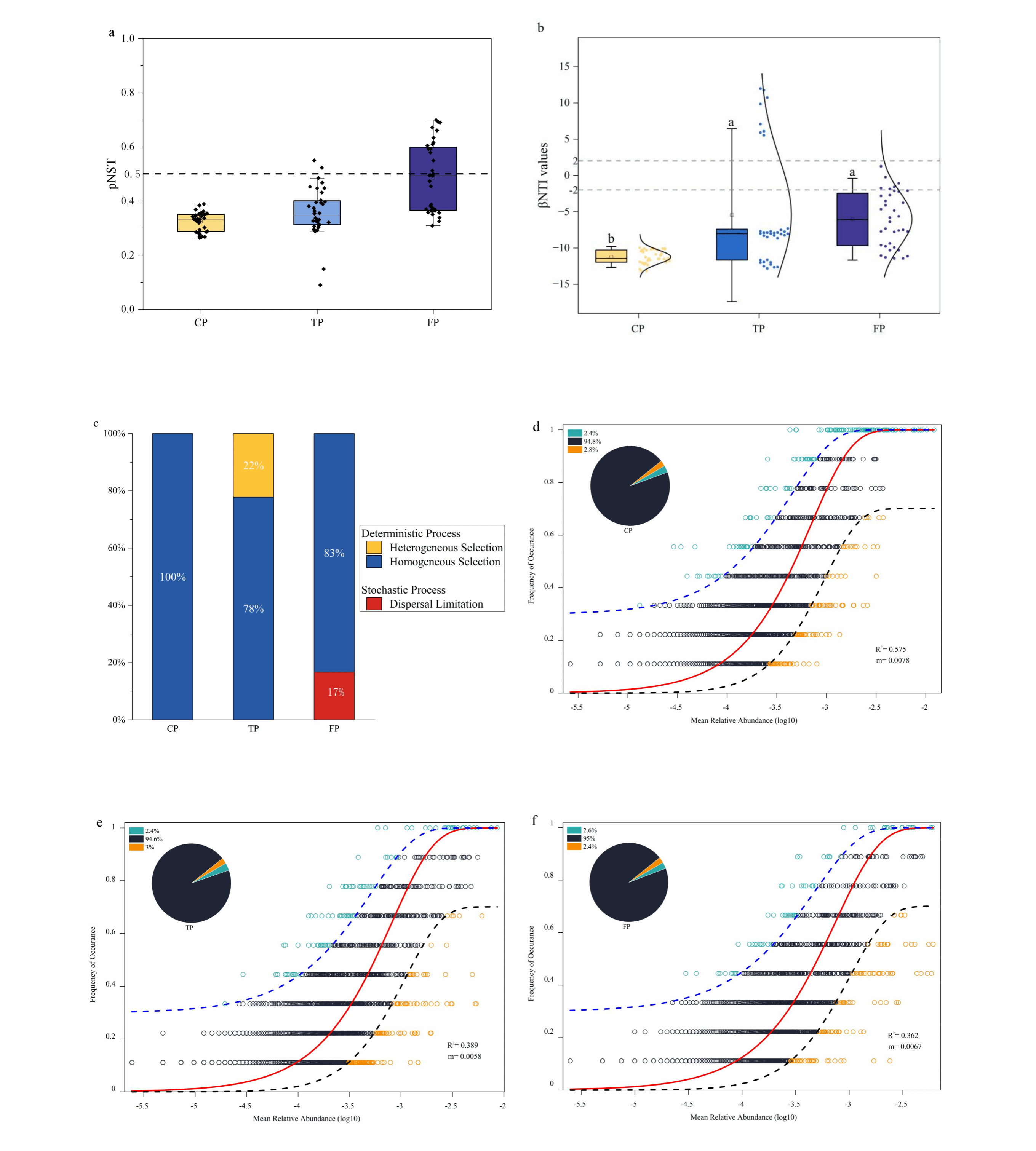 随着环境条件的变化,细菌群落的构建机制会从“以确定性过程主导(如环境筛选与生物互作等)”逐渐转变为“随机性过程与确定性过程共同作用”。光伏阵列的安装模式改变了土壤细菌群落的组装模式,在平顶式光伏模式下,随机性过程的相对贡献有所增加,扩散限制的占比为17%,同质化选择的占比则为83%。研究表明,尽管环境筛选仍在主导群落构建,但随机性过程已开始对群落结构产生重要影响。