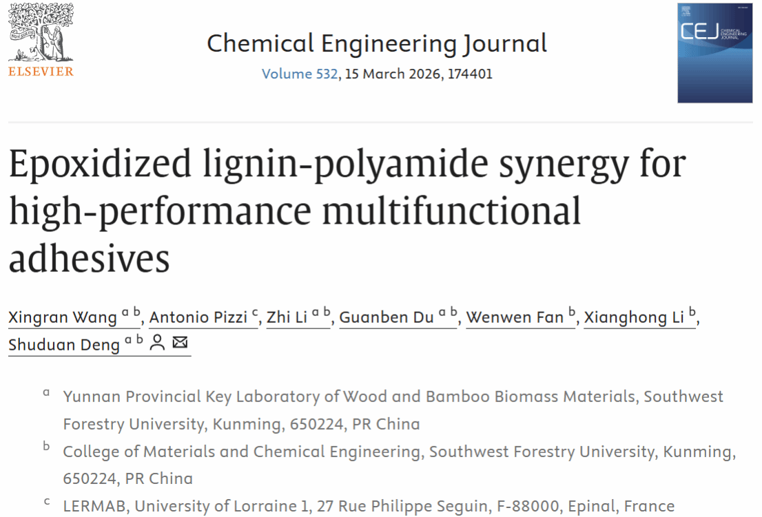 近日,我校材料与化学工程学院邓书端教授团队在国际权威期刊《Chemical Engineering Journal》(中科院一区TOP,IF:13.3)上发表题为“Epoxidized lignin-polyamide synergy for high-performance multifunctional adhesives”的研究论文。