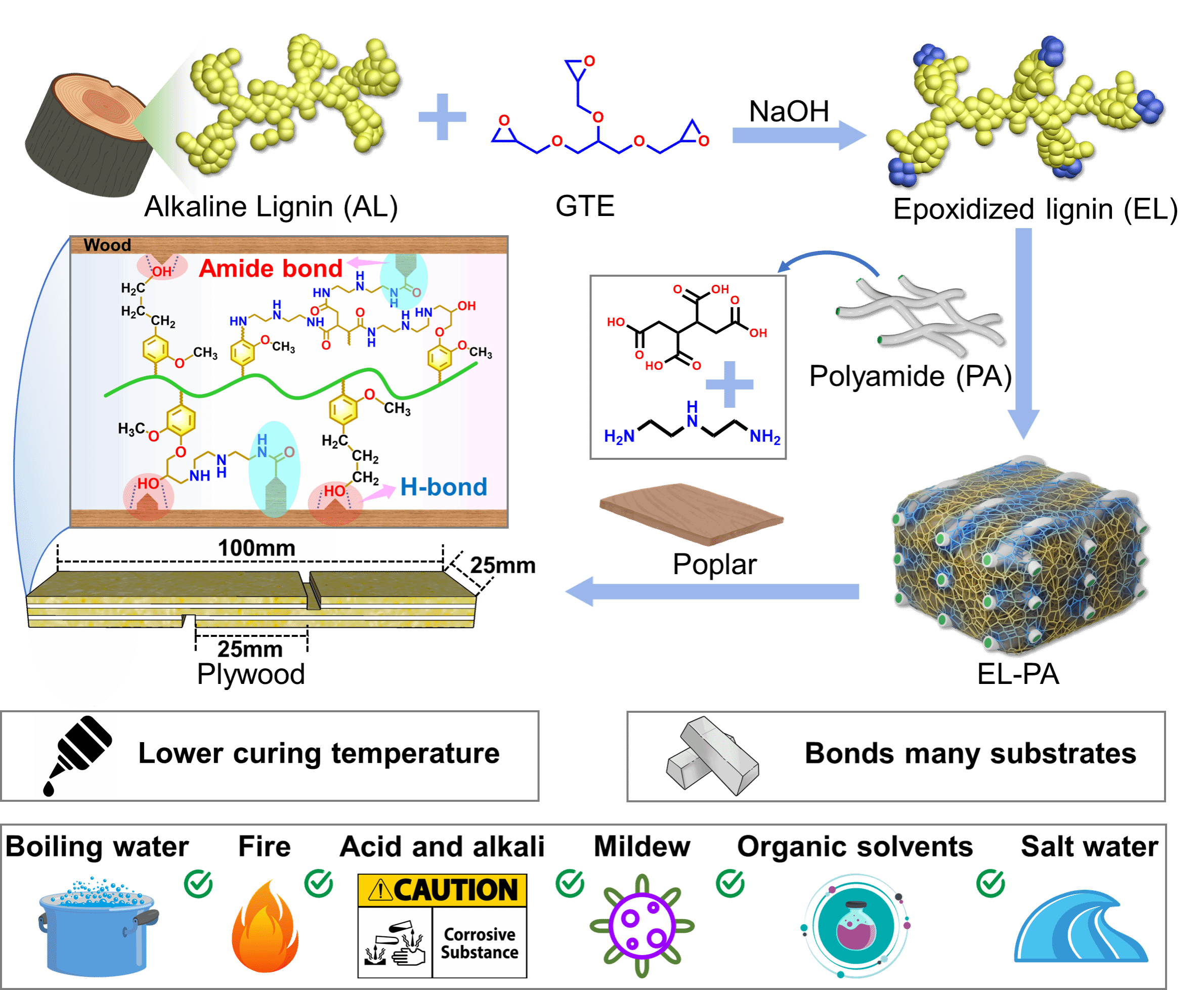 该论文的第一作者为2025级博士研究生王星然,邓书端教授担任通讯作者。该研究团队针对传统甲醛系胶黏剂的甲醛释放问题以及木质素基胶黏剂耐水性能差、功能单一等技术难题,创新性提出了一种基于环氧化木质素与聚酰胺协同构建高性能多功能胶黏剂的新策略。通过该策略构建的环氧化木质素-聚酰胺共价交联网络显著提升了胶黏剂的耐水性,并拓宽了胶黏剂的使用场景。同时,该策略开辟了工业副产物木质素高值化利用的新途径。