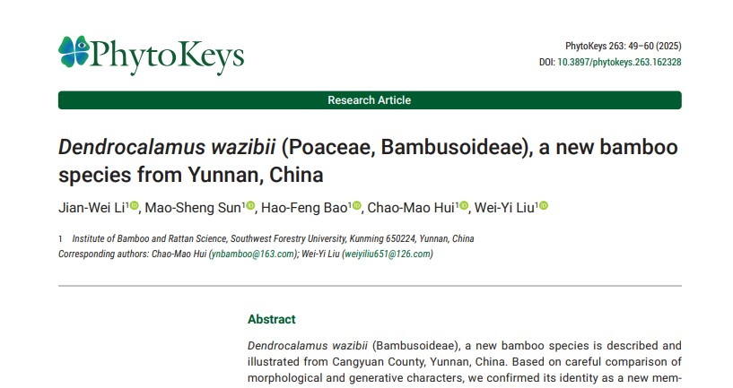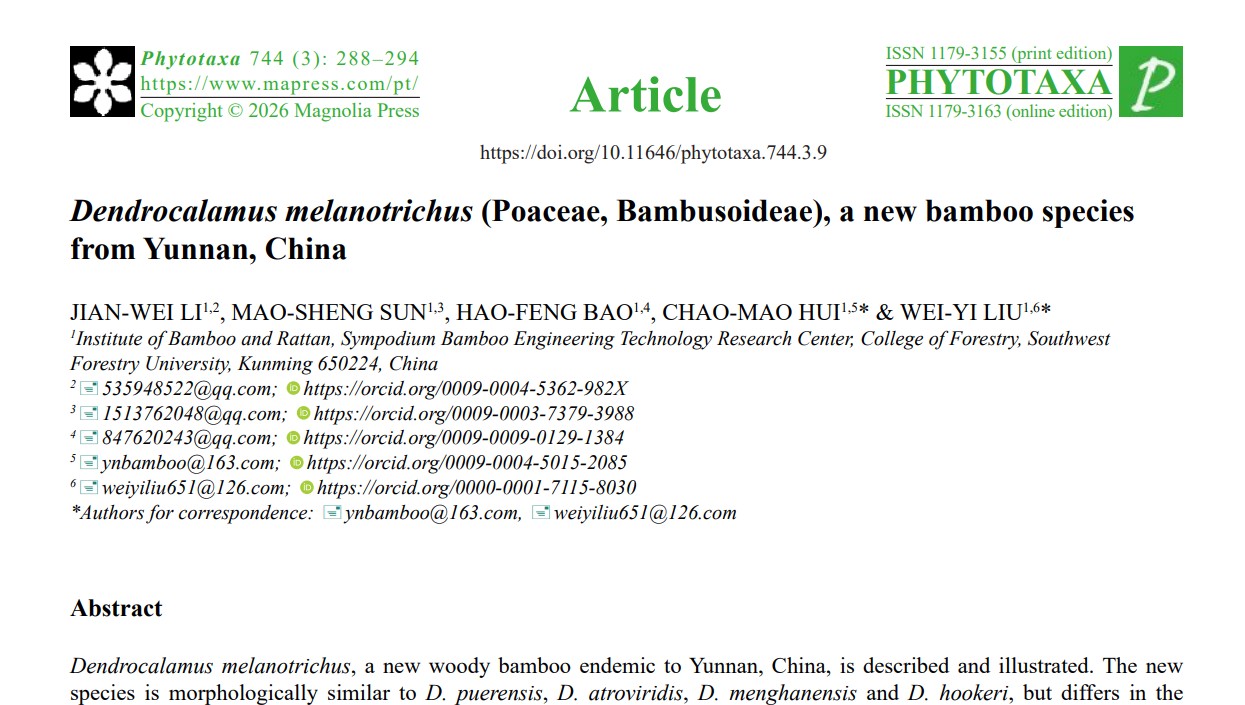 最近,我校竹类研究团队李建伟博士在其博士论文外业调查研究中,在滇西南阿佤山区发现了竹亚科牡竹属三个大型丛生竹类新种——黑毛龙竹、灰白龙竹和鼓节龙竹,分别发表于国际植物分类学权威刊物《Phytotaxa》2026年第744期、《PhytoKeys》2025年第263期和《Plants》2025年第14期。