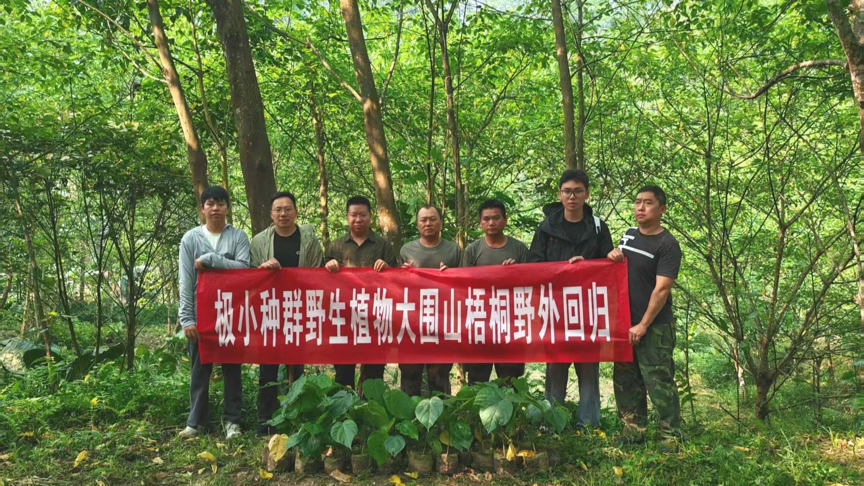 在云南省林业和草原局野生动植物保护专项项目的资助下,林学院王逸之团队启动了大围山梧桐的保护工作,系统收集河口、马关、麻栗坡等主要分布区的地理种源,建立科学的人工繁育技术体系,成功培育出健康幼苗。2026年4月9日至11日,团队将100株人工繁育幼苗回归种植于大围山国家级自然保护区河口片区,构建了标准化的回归保护种群,有效促进了大围山梧桐种群的实质性恢复,降低其灭绝风险。